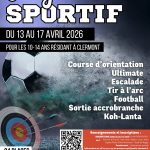Pendant les vacances d’avril, la Ville de Clermont propose aux jeunes un stage sportif fun et dynamique, encadré par 2 éducateurs sportifs ! Pour les 10–14 ans résidant à ClermontDu 13 au 17 avril 2026Espace Marie-Claire Martineau – Stade de Rugby24 places Au programme :Course d’orientationUltimateEscaladeTir à l’arcFootball Sortie accrobrancheKoh-Lanta Horaires :Accueil : 8h30 – 9h00Départ : 17h30 – 18h00 Renseignements et inscriptions :Inscriptions jusqu’au 29/03/2026 via My PERISCHOOL06 67 44 02 79 – maxance.reyt@mairie-clermont.fr