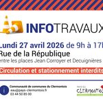 🚧 Info travaux – Rue de la République Des travaux seront réalisés lundi 27 avril 2026 sur la rue de la République, entre les places Jean Corroyer et Decuignières.