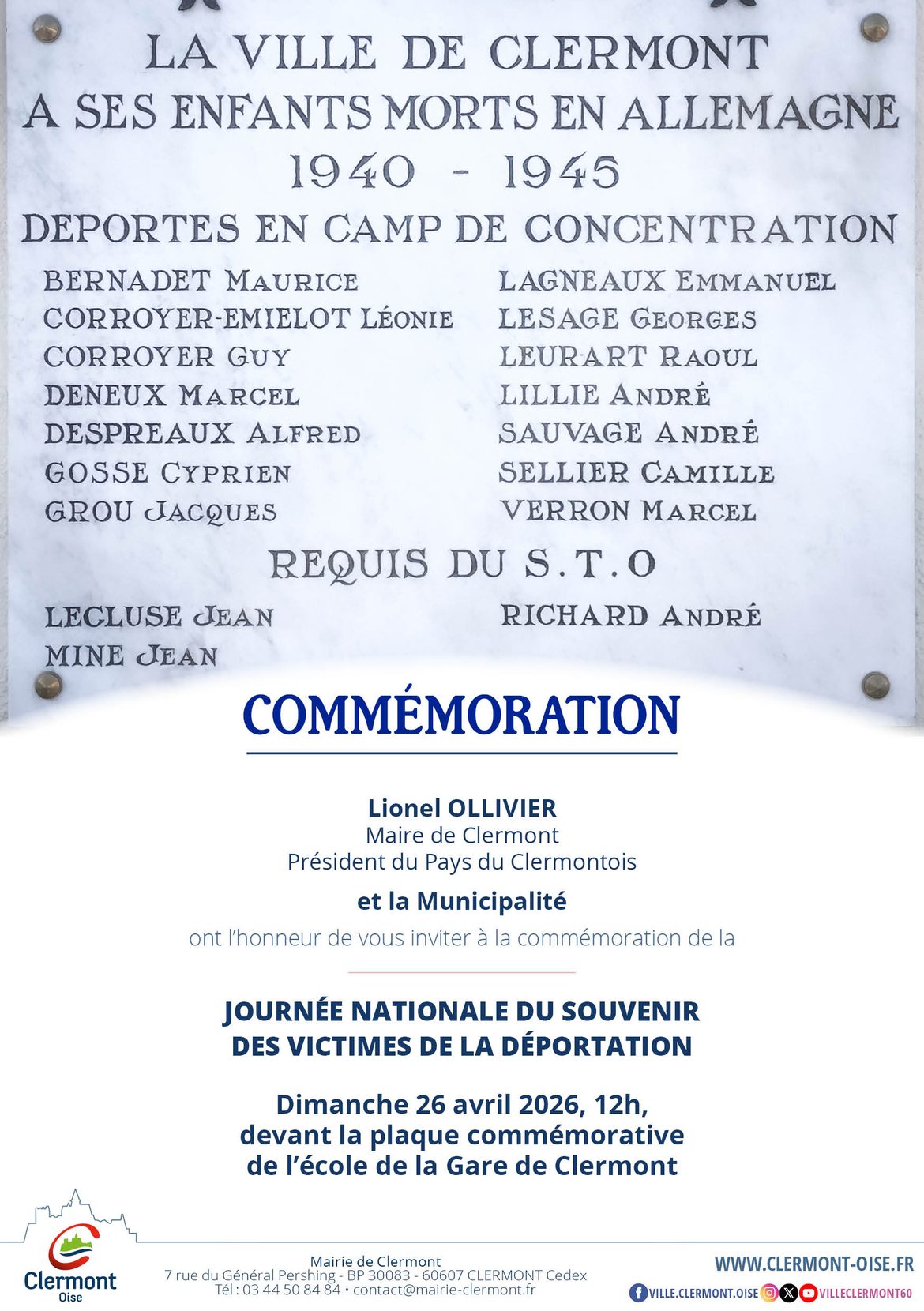 Commémoration – Journée nationale du souvenir des victimes de la déportation, 26 avril 2026 – Ville de Clermont (Oise) – Site Officiel