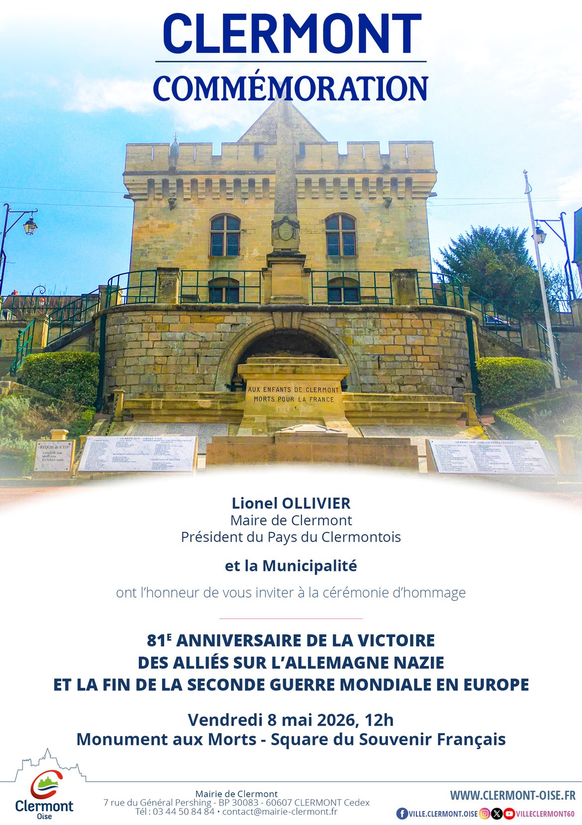 🇫🇷 Commémoration du 8 mai 1945 – La Ville de Clermont vous invite à la cérémonie d’hommage à l’occasion du 81ᵉ anniversaire de la victoire des Alliés sur l’Allemagne nazie et de la fin de la Seconde Guerre mondiale en Europe