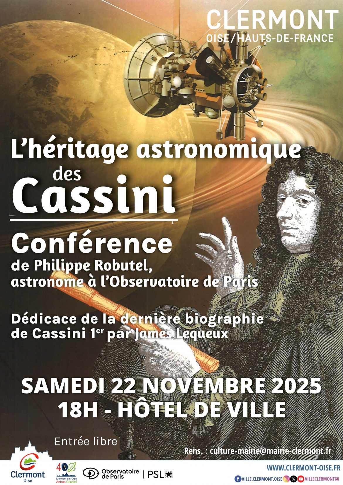 🪐✨ Conférence – L’héritage astronomique des Cassini ✨🪐 La Ville de Clermont vous invite à une conférence exceptionnelle autour de la célèbre dynastie des Cassini, astronomes et cartographes de génie, dont l’œuvre a marqué l’histoire des sciences et de l’observation du ciel 🌟