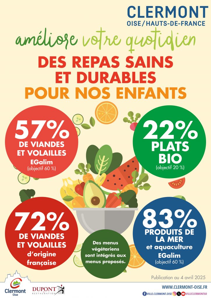 La commune de Clermont s’engage pour une alimentation de qualité dans ses trois cantines scolaires : Pierre Viénot, Belle Assise et Les Sables. Grâce à notre prestataire Dupont Restauration, nous garantissons des repas équilibrés et respectueux des normes EGalim.