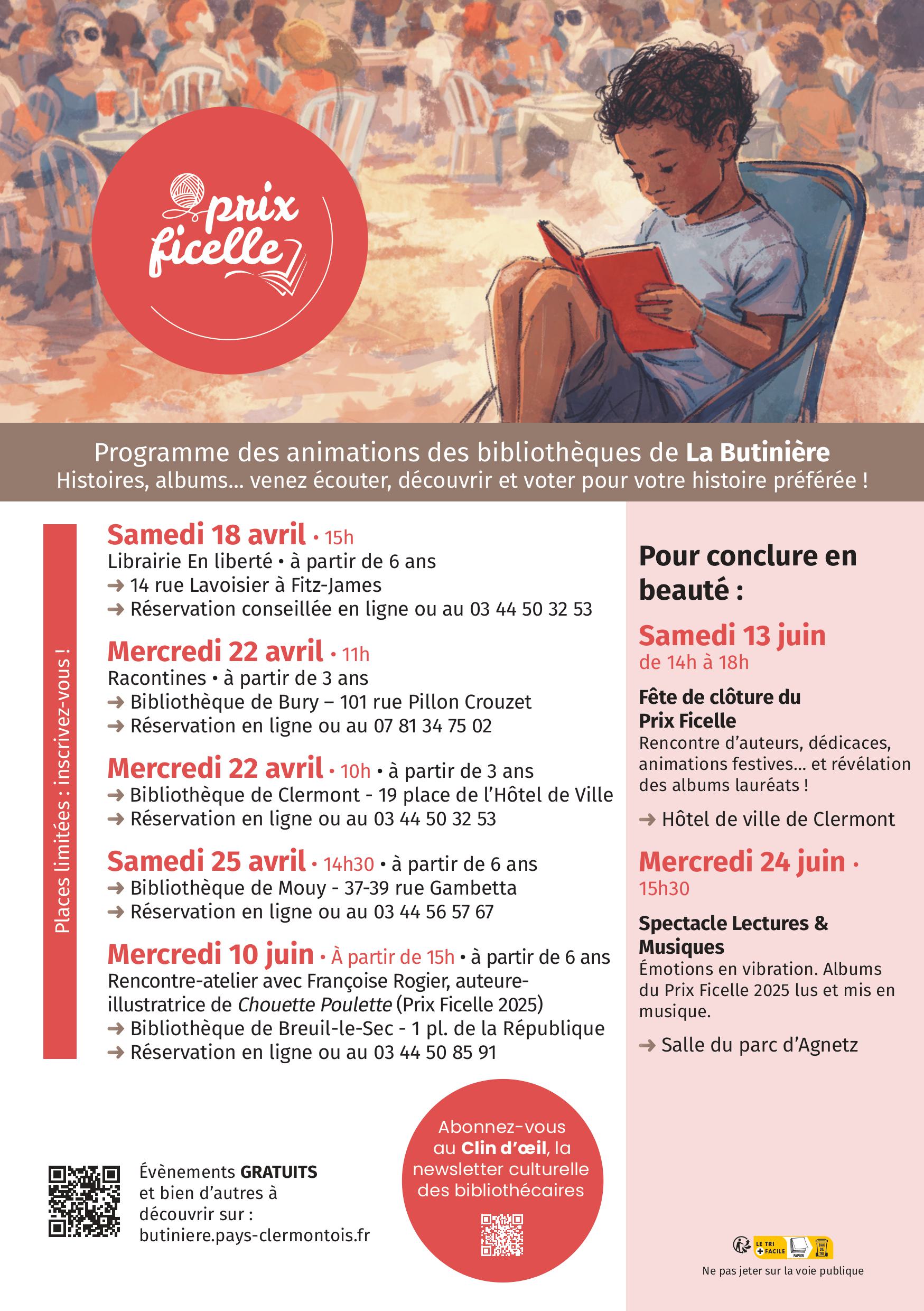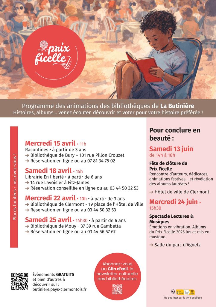 Dans le cadre de la 16ᵉ édition du Prix Ficelle, les bibliothèques du réseau La Butinière vous proposent de nombreuses animations autour de la littérature jeunesse.
