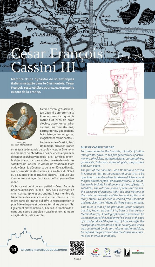 Ce buste est celui de son petit-fils César François Cassini, dit Cassini III, né à Thury-sous-Clermont en 1714. Cartographe et astronome, il est membre de l’Académie des sciences à 22 ans et réalise la première carte de France qui offre la représentation la plus fidèle du pays et qui sera terminée par son fils. Également mathématicien, il définit la fonction donnant une courbe appelée “Cassinienne”. Il meurt le 4 septembre 1784 de la petite vérole.
