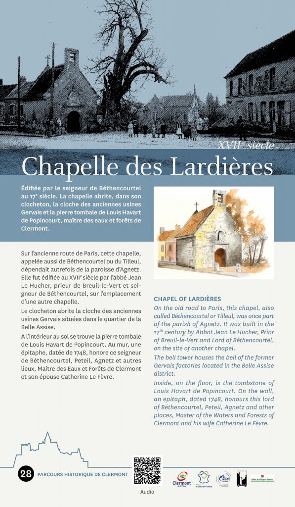 Sur l’ancienne route de Paris, cette chapelle, appelée aussi de Béthencourtel ou du Tilleul, dépendait autrefois de la paroisse d’Agnetz. Elle fut édifiée au XVIIe siècle par l’abbé Jean Le Hucher, prieur de Breuil-le-Vert et seigneur de Béthencourtel, sur l’emplacement d’une autre chapelle.