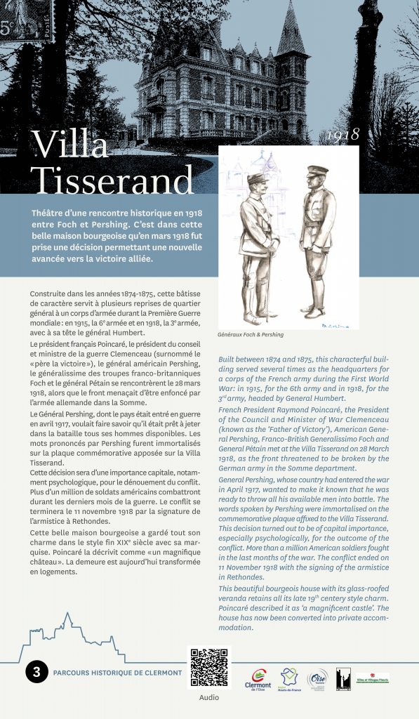 Construite dans les années 1874-1875, cette bâtisse de caractère servit de quartier général à l’armée française durant la Grande Guerre. Le général Humbert, le président français Raymond Poincaré, le président du conseil et ministre de la guerre Georges Clemenceau (surnommé le «père la victoire»), le général américain Pershing, le généralissime des troupes franco-britanniques Foch et Pétain : tous ces grands noms de l’Histoire passèrent entre les murs de la Villa Tisserand en 1918.